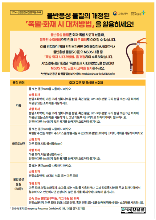 물반응성 물질의 개정된 폭발·화재 시 대처방법 작성자관리자 등록일 25-07-07 조회246회 본문 물반응성 물질의 개정된 폭발·화재 시 대처방법1. 물질유형별 화재 규모 및 특성별 소화제2. MSDS상「 폭발·화재시 대처방법」 을 개정한 물반응성 물질 목록 첨부파일 [2024-산업안전보건연구원-804]_최종 물반응성 물질의 「폭발·화재 시 대처방법」 개정 OPS 자료.pdf (160.5K) 외국인 작업자를 위한 12대 안전수칙 (19개국) 교량 설치 해체 작업 관련 안전사고 예방 자료 목록