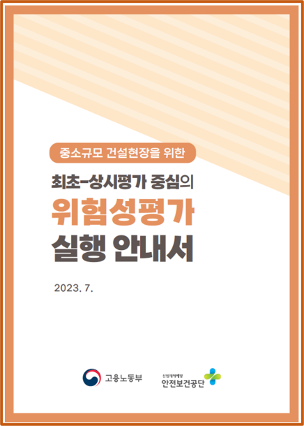3. 2023.7_중소규모 건설현장을 위한 최초-상시평가 중심의 위험성평가 실행 작성자관리자 등록일 25-07-07 조회229회 본문 3. 2023.7_중소규모 건설현장을 위한 최초-상시평가 중심의 위험성평가 실행중소규모 건설현장을 위한 최초-상시평가 중심의 위험성평가 실행 안내서 첨부파일 2023.7_중소규모 건설현장을 위한 최초-상시평가 중심의 위험성평가 실행안내서.pdf (7.7M) 2. 2023.9_ 소규모 사업장을 위한 위험성평가 안내서 4. 2023.6 중소규모 사업자을 위한 쉽고 간편한 위험성평가 방법 안내서 목록