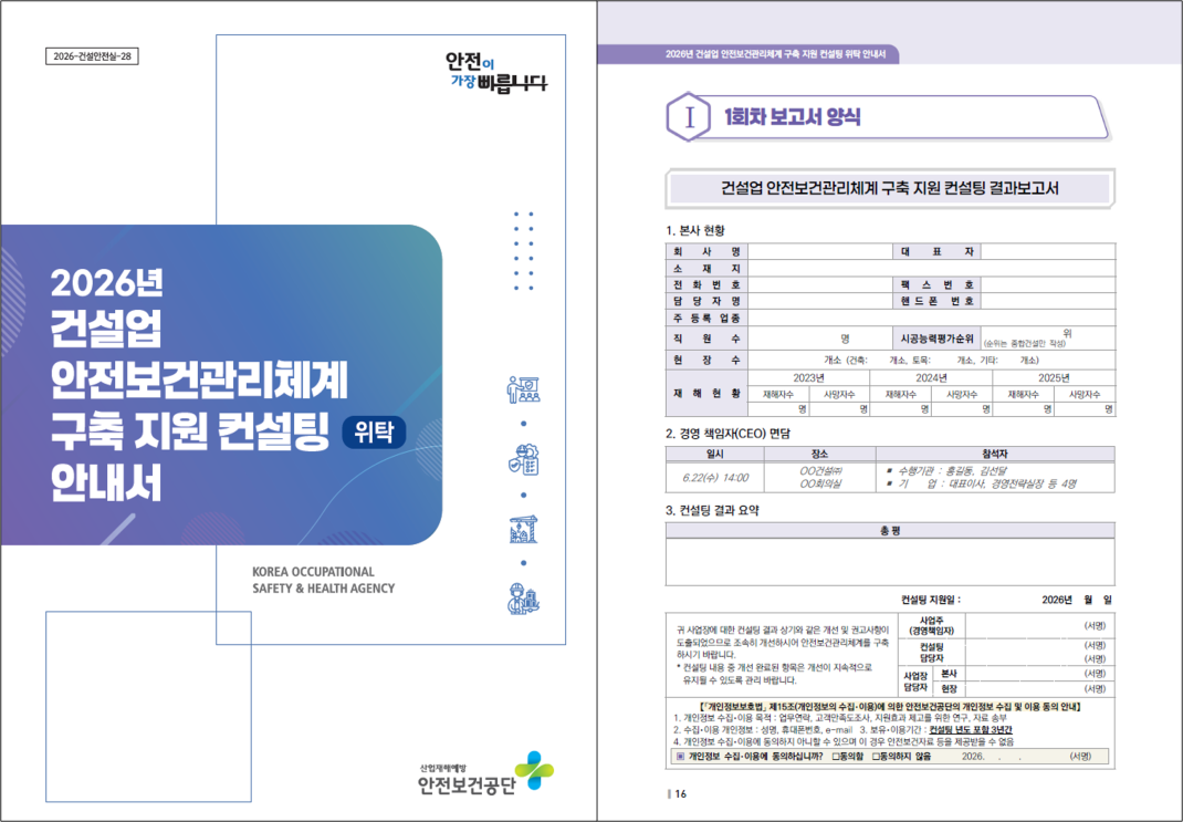 2026년 건설업 안전보건관리체계 구축 지원 컨설팅 안내서 작성자관리자 등록일 26-02-24 조회123회 본문 2026년 건설업 안전보건관리체계 구축 지원 컨설팅 안내서 첨부파일 [2026-건설안전실-28]2026년 건설업 안전보건관리체계 구축 지원 컨설팅위탁 안내서.pdf (48.4M) 외국인 근로자용 이동식비계 안전작업 (16개국) 2025 안전문화 실천추진단 활동 사례집 목록