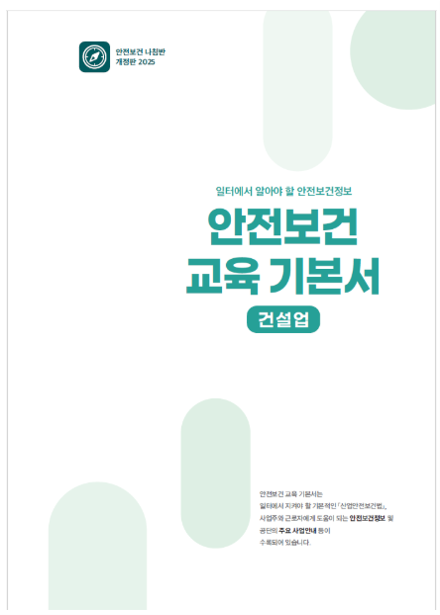 2025 안전보건 교육 기본서 "건설업" 작성자관리자 등록일 25-07-07 조회279회 본문 2025 안전보건 교육 기본서 "건설업"1. 사업장에서 알아야 할 산업안전보건법 주요 내용2. 사업장에서 알아야 할 중대재해처벌법 주요 내용3. 건설업 사망재해 다발작업공종4. 건설업 사망재해 예방대책5. 주요 지원 사업6. 재해예방 유관기관 현황 첨부파일 [2025-교육혁신실-232] 2025년 안전보건 교육 기본서 내지건설업 Web.pdf (7.3M) 온열질환예방지침 (외국인용-17개국) 외국인근로자용 고소작업대 안전작업 가이드 (20개국) 목록