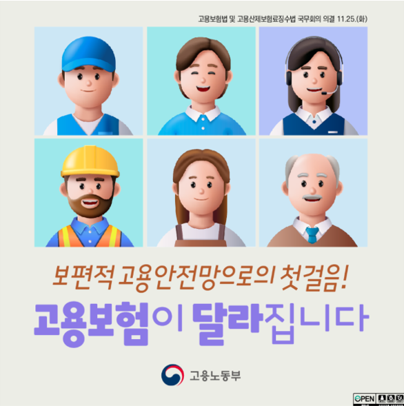 정부는 11월 25일(화) 국무회의에서 고용노동부 소관 법령인 「고용보험법」 및 「고용산재보험료징수법」 일부개정안을 심의·의결했습니다. 이는 '고용보험 사각지대 해소'를 위한 제도개선으로 주요 내용은 다음과 같습니다.