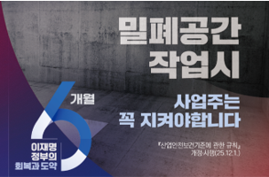 아울러, 고용노동부는 개정안의 시행과 함께 질식사고 위험작업 보유 사업장(동절기 건설현장 포함)을 대상으로 질식사고 예방 안전수칙 준수를 적극 안내 · 홍보할 예정입니다.