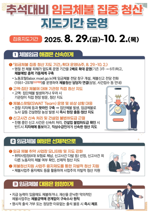 고용노동부(장관 김영훈)는 다가오는 추석 명절에 대비하여, 8월 29일부터 10월 2일까지 6주간 「임금체불 집중 청산 지도기간」을 운영 한다고 밝혔습니다.