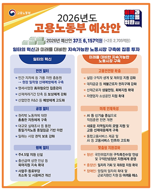 고용노동부는 2026년 예산을 일하는 사람의 생명과 안전을 최우선으로 보호하는 "안전 일터", 일한 만큼 보상 받고 불합리한 차별이 없는 "공정 일터", 장시간 근로 하지 않고 일·가정 양립이 지켜지는 "행복 일터" 등 국민 삶의 근간이 되는 "일터의 혁신"에 집중 투자할 계획입니다. 또한, 취약 노동자에 대한 고용안전망 확충, 인공지능(AI) 등 신기술 중심의 인재 양성, 청년·중장년·장애인의 특성을 고려한 맞춤형 지원 등 미래를 대비한 노동시장 구축에 투자를 확대할 계획입니다.