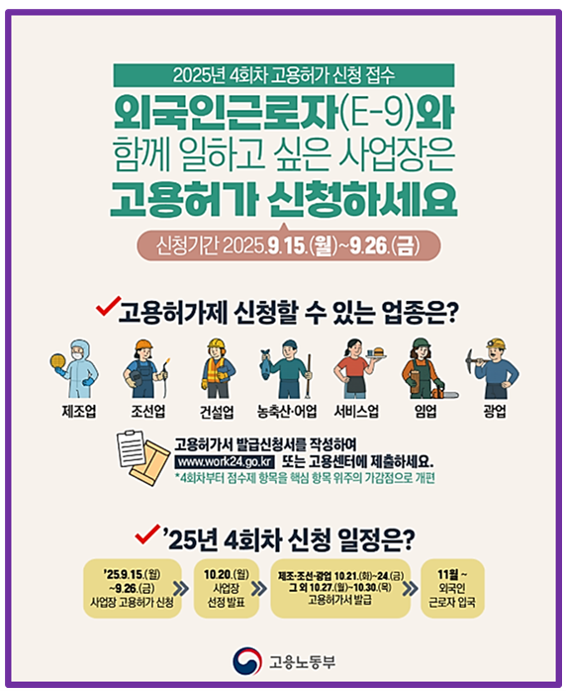 고용노동부는 9월 15일부터 9월 26일까지 전국 지방고용노동관서를 통해 외국인근로자(E-9)에 대한 올해 4회차 신규 고용허가 신청을 받습니다.