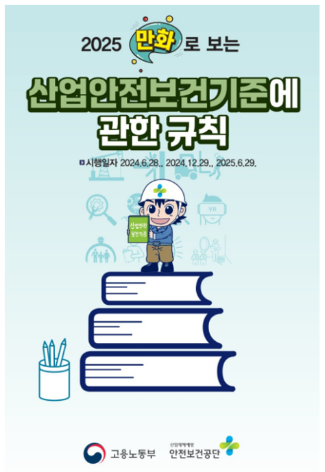 안전보건공단(이사장 김현중, 이하 '공단')은 산업현장 근로자와 일반 국민이 산업안전보건 규칙을 더 쉽고 재미있게 이해할 수 있도록 제작한<만화로 보는 산업안전보건기준에 관한 규칙(이하, '만화규칙')>을 전자책(e-Book)*형태로 전환하여 무료로 배포합니다.