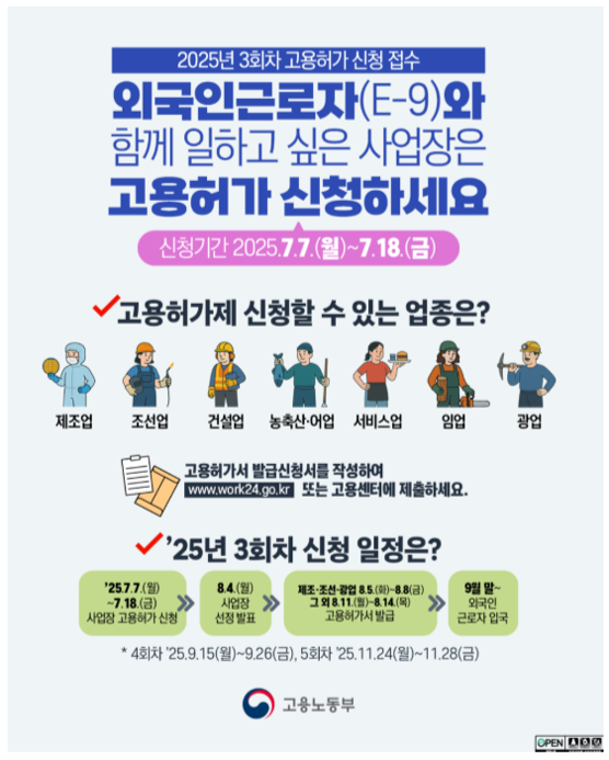 고용노동부는 7월 7일부터 7월 18일까지 전국 지방고용노동관서를 통해 외국인근로자(E-9)에 대한 올해 3회차 신규 고용허가 신청을 받습니다.