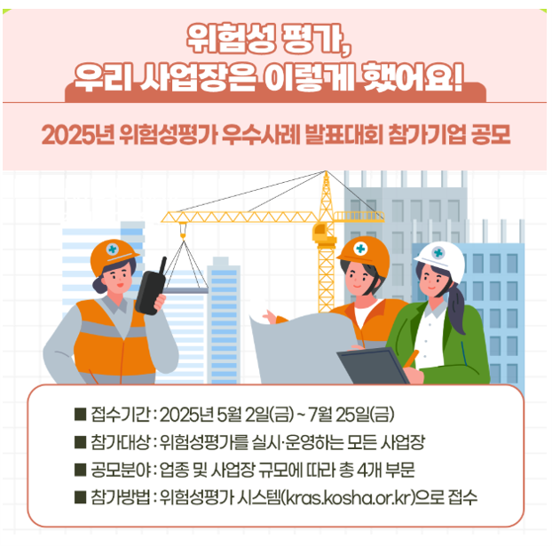 고용노동부와 안전보건공단은 오는 5월 2일(금)부터 7월 25일(금)까지 '2025년 위험성평가 우수사례 발표대회' 참가기업을 모집합니다.