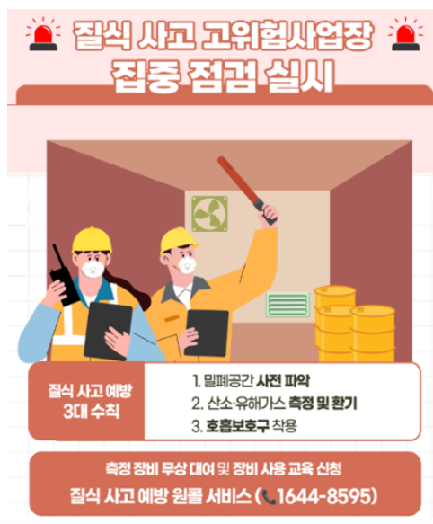 한편, 산업안전보건공단의 '질식 재해 예방 원콜(One-call) 서비스'를 통해 산소 · 유해가스 측정기, 환기 장비, 호흡보호구 등이 갖춰지지 못한 사업장에 대한 지원사업도 병행합니다. 1644-8595번으로 연락을 하면 사업장 밀폐공간 안전관리 관련 각종 상담 및 지원을 받을 수 있습니다.