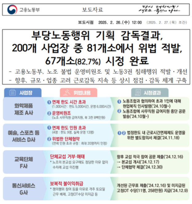 고용노동부, 부당노동행위 기획 근로감독 결과 발표 작성자관리자 등록일 25-07-04 조회152회 본문 고용노동부, 부당노동행위 기획 근로감독 결과 발표 첨부파일 250226 부당노동행위 기획 근로감독 결과 발표노사관행개선과7.pdf (856.8K) 건설현장 추락사고, 매년 10% 이상 단계적 감축 추진 노동약자 보호·안전일터 지원을 위한 2025년 「사업장 감독계획」발표 목록