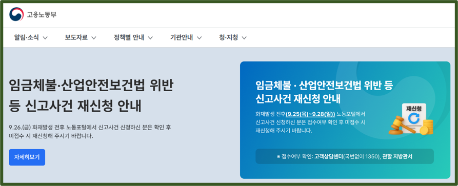 지난 9.26. 발생한 국가정보자원관리원 화재로 인해 고용노동부의 17개 입주시스템이 전면 중단되어 임금체불 등 신고사건처리에 불편이 발생함에 따라, 고용노동부는 전산 장애 안내와 이를 대체할 시스템*을 구축 하고, 민원 접수 방법 등 고객 불편을 최소화하는 방안을 고용24, 고객상담센터 누리집 등을 통해 국민에게 적극적으로 안내해 왔습니다. (*지방관서별 대표 이메일 등을 통한 임시 온라인 민원 접수, 임시 노사누리 개통을 통한 민원접수 및 신고사건처리 대장의 관리 등)