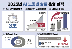 고용노동부(장관 김영훈)는 21일 국민의 노동법 궁금증을 실시간으로 해결해 주는 ‘AI 노동법 상담’ 서비스의 2025년 운영 실적과 이용자 분석 결과를 발표했다. 지난 한 해 동안 총 11.7만 건의 상담을 처리하며, 노동 행정의 인공지능 전환(AX)을 성공적으로 이끌었다는 평가다.