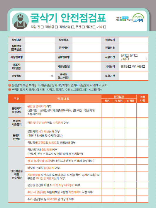 고위험 건설기계장비 안전점검표(5종) 작성자관리자 등록일 25-07-01 조회219회 본문 고위험 건설기계장비 안전점검표(5종)1. 굴삭기 안전점검표2. 트럭류 안전검검표3. 차량탑재형 고소작업대 안전점검표4. 이동식크레인 안전작업표5. 지게차 안전점검표 첨부파일 고위험 건설기계장비 안전점검표5종.pdf (6.1M) 전기작업 작업계획서 작성 교안 및 작업계획서 샘플 50억 이상 시공현장 자율점검표 목록