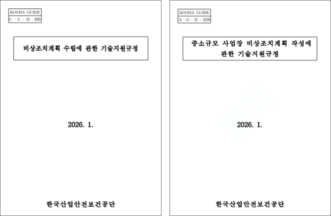 비상조치계획 수립 관련 기술지원규정 작성자관리자 등록일 26-04-06 조회1회 본문 비상조치계획 수립 관련 기술지원규정 첨부파일 C-C-55-2026 비상조치계획 수립에 관한 기술지원규정.pdf (364.0K) A-G-15-2026 중소규모 사업장 비상조치계획 작성에 관한 기술지원규정.pdf (5.9M) 비상훈련 실시보고서 양식 위험공종 안전 실명제 표지판(안) 목록