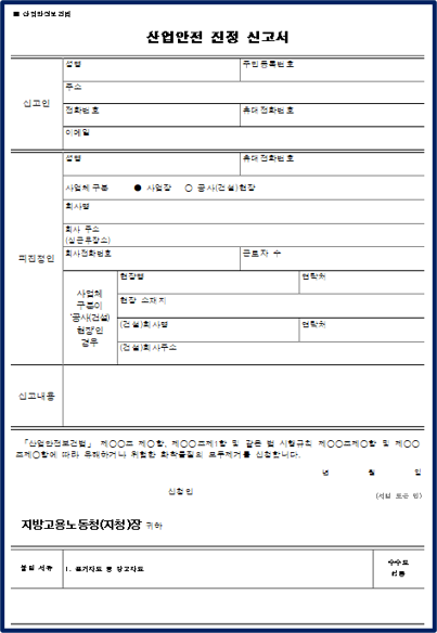 산업안전 진정 신고서 양식 작성자관리자 등록일 25-07-01 조회144회 본문 산업안전 진정 신고서 양식 첨부파일 산업안전 진정 신고서.hwp (36.0K) MSDS 이행실태 자율점검표 제조업 정밀안전점검보고서(게시용) 양식 목록