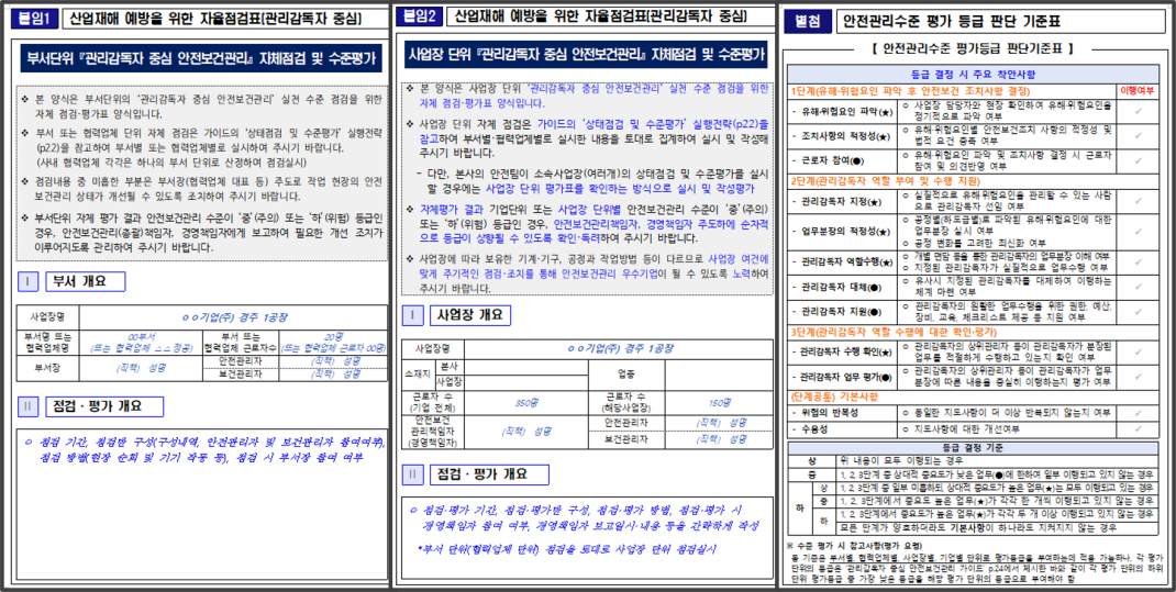 관리감독자 중심 안전보건관리 부서단위, 사업장단위 자울점검표, 평가등급 판단기준표 작성자관리자 등록일 25-07-01 조회157회 본문 관리감독자 중심 안전보건관리 부서단위, 사업장단위 자울점검표, 평가등급 판단기준표 첨부파일 관리감독자 중심 안전보건관리 부서단위.hwp (110.0K) 안전관리/보건관리전문기관¸ 건설재해예방전문지도기관 지정 및 변경신청서 (2024.06.28 개정) MSDS 이행실태 자율점검표 목록