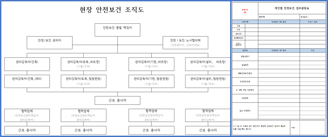 건설현장 안전보건조직도 양식 작성자관리자 등록일 25-12-04 조회82회 본문 건설현장 안전보건조직도 양식 첨부파일 건설현장 안전보건조직도 양식1.hwp (39.0K) 건설현장 안전보건조직도 양식2.hwp (40.0K) 건설현장 안전보건조직도 양식3.hwp (60.5K) 소방시설 관련 각종 양식 (7종) 일요일 공휴일 작업계획서 제출 서식 목록