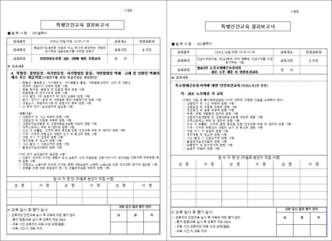 특별안전교육 결과 보고서 양식 작성자관리자 등록일 26-02-24 조회92회 본문 특별안전교육 결과 보고서 양식 첨부파일 특별안전교육 결과보고서.xlsx (471.0K) 중장비 작업계획서 및 중량물 취급계획서 양식 타워크레인 설치·조립·해체 작업계획서 작성 교안 및 샘플 목록