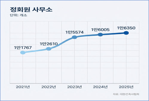 대한건축사협회에 따르면 정회원 수는 2021년 1만2462명에서 지난해 1만7472명으로 4년 새 약 40% 증가했다. 같은 기간 건축사사무소도 39% 확대됐다. 특히 2023년 신규 입회자는 3379명으로 최근 5년래 최대치를 기록했는데, 이는 건축사 자격시험이 2020년부터 연 2회로 확대된 영향으로 분석된다.
