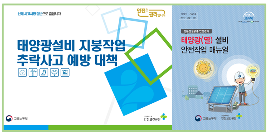 태양광 설비 지붕작업 추락사고 예방대책 및 안전작업 매뉴얼 작성자관리자 등록일 25-08-18 조회276회 본문 태양광 설비 지붕작업 추락사고 예방대책 및 안전작업 매뉴얼 첨부파일 [2020-교육홍보본부-312] 태양광 설비 지붕작업 추락사고 예방 교안.pptx (21.3M) [2016-건설-557] 태양열광 설비 안전작업 매뉴얼내지최종.pdf (10.1M) [2025-교육혁신실-130] 2025 태양광설비 지붕작업 리플릿 Web.pdf (4.1M) [2020-교육홍보본부-390] 태양광설비 지붕작업 리플렛웹용.pdf (1,019.9K) [2020-교육홍보본부-313] 태양광설비 지붕작업 추락사고예방 안전대책_OPL웹용.pdf (576.7K) 국토안전관리원 '굴착기 안전작업 가이드' 발간 지붕 공사 중 추락으로 인한 사고 예방대책 목록