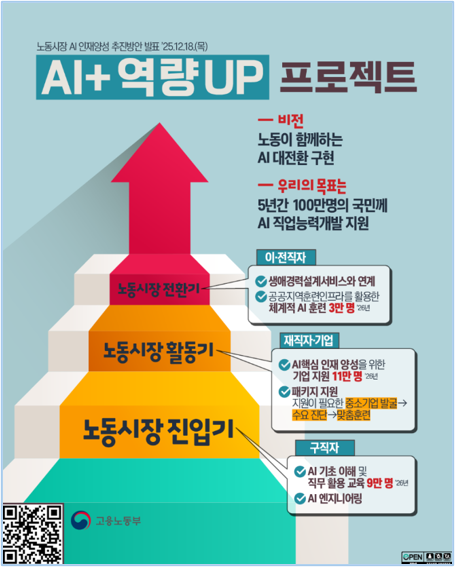고용노동부(장관 김영훈)는 12.18.(목) 정부서울청사에서 열린 제2차 과학기술관계장관회의에서 「노동시장 AI 인재양성 추진방안 : Al+역량 Up 프로젝트」를 발표했습니다. 이번 대책은 지난 12.11.(목)에 있었던 고용노동부 업무보고의 후속 대책으로, 노동시장 진입 • 활동 · 전환기에 있는 모든 국민의 인공지능(이하, 'AI') 활용역량 강화에 초점을 두고 마련되었습니다.