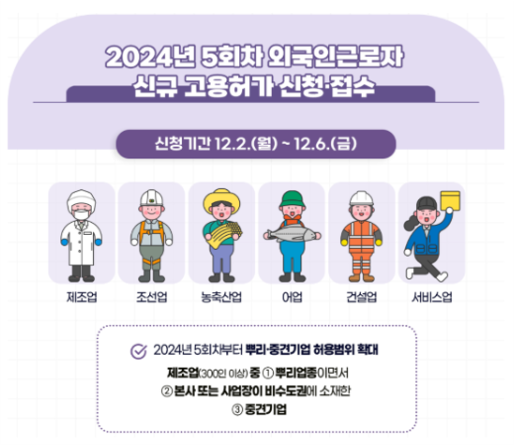 5회차 고용허가 신청 결과는 12월 19일에 발표되며, 발급은 제조업·조선업·광업의 경우 12월 20일부터 12월 24일, 농축산·어업, 임업, 건설업, 서비스업은 12월 26일부터 12월 31일에 진행될 계획입니다.