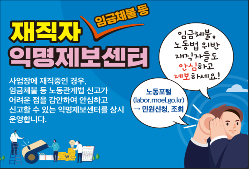 한편, 고용노동부는 2.2(월)부터 「재직자 익명제보센터」를 상시적으로 운영하고, 금년에는 이를 토대로 한 감독을 2배 이상 대폭 확대한다고 밝혔다. 여전히 체불, 장시간 근로 노동관계법 보호의 사각지대에 있음에도 재직 중인 상황에서는 신고 등 문제 제기가 쉽지 않다는 현실적 어려움을 감안한 조치이다.