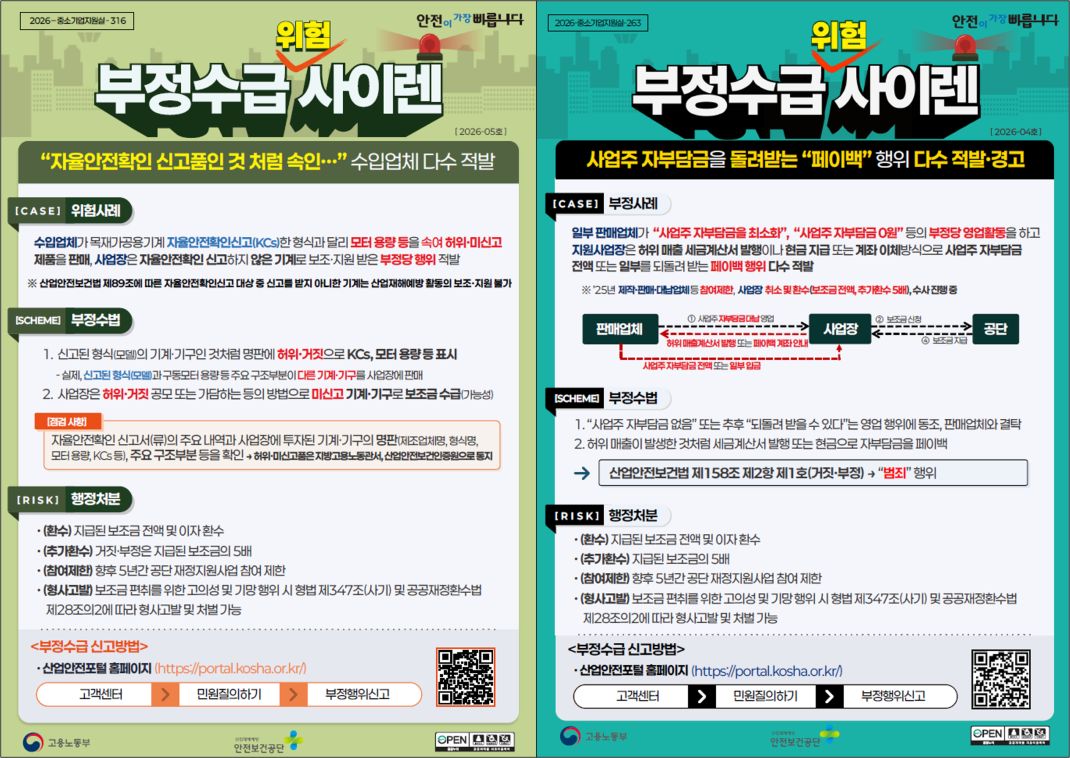 부정수급 위험 사이렌 (2가지) 작성자관리자 등록일 26-04-27 조회1회 본문 부정수급 위험 사이렌 (2가지) 첨부파일 [2026-중소기업지원실-263]붙임_부정수급 위험 사이렌제2026-04호_최종.pdf (206.0K) [2026-중소기업지원실-316]붙임_부정수급 위험 사이렌제2026-05호.pdf (127.6K) “숨어있는 체불”과 “공짜노동” 근절을 위한 재직자 익명제보 근로감독 착수 목록