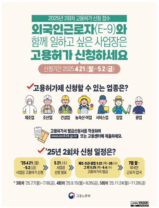 더 나은 내일을 위한 준비, 외국인근로자 고용허가 신청 서두르세요. 작성자관리자 등록일 25-07-05 조회131회 본문 더 나은 내일을 위한 준비, 외국인근로자 고용허가 신청 서두르세요. 첨부파일 250413 2025년 2회차 외국인근로자 고용허가 신청 접수외국인력담당관.pdf (238.9K) 2025 건설업 산재예방 안전시설 맞춤형 패키지 지원 (수정 공고문) 건설현장 추락 및 붕괴, 화재 사고 예방 집중점검! 목록