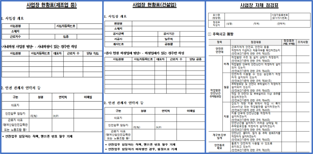 사업장 현황표(제조, 건설) 및 자체 점검표 작성자관리자 등록일 25-11-26 조회53회 본문 사업장 현황표(제조, 건설) 및 자체 점검표 첨부파일 사업장 현황표건설업.hwp (41.5K) 사업장 현황표제조업 등.hwp (37.0K) 사업장 자체점검표.hwpx (88.7K) 일요일 공휴일 작업계획서 제출 서식 건설업 자율안전컨설팅 관련 양식 목록